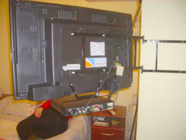 Afortunadamente la pared donde lo instalé es más fuerte de lo que esperaba, así que lo hice mucho trabajo hacer los seis orificios de 8mm para fijar con fischer, tapones y tornillos de acero. Una vez atornillada a la pared el bastidor correspondiente, tuve que pedir mi esposa ayuda a poner los tornillos en las bisagras mientras que sostenía el televisor (11 kg, si usted quiere saber).