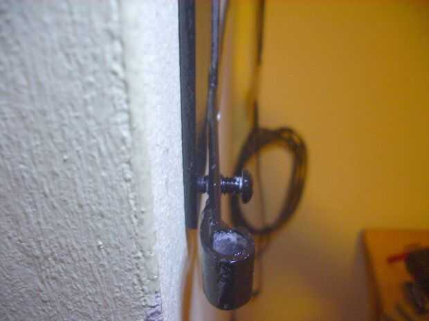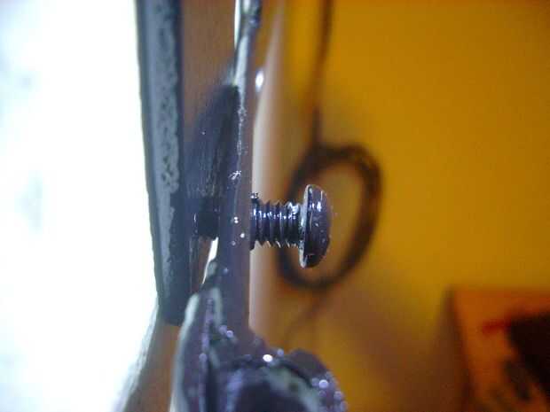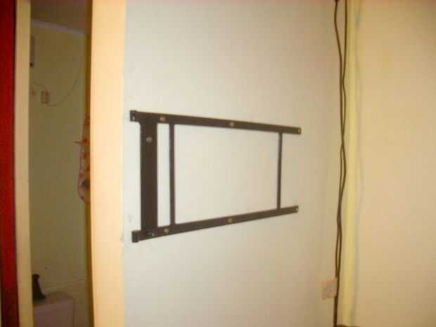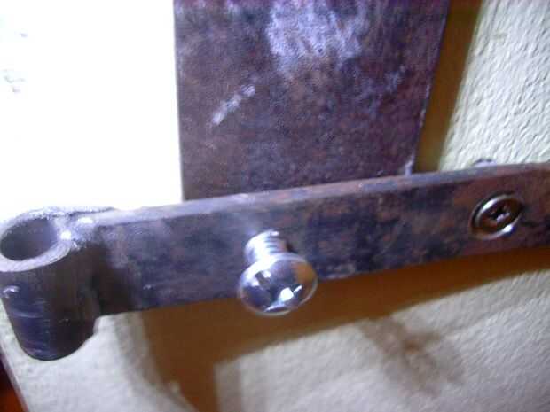 Vino otro pequeño problema: la pared no fue bien verticalmente, por lo que la TV tiende a abrir la pared, siendo perpendicular a este, ejerciendo fuerza en el marco de la pared en la peor posición posible. Se resolvió muy fácilmente por soldadura a la estructura de la pared un refuerzo de hierro sólido cerca de la bisagra superior y la adición por un tornillo que se aprieta contra el respaldo y separado de la pared de la bisagra inferior. Santo remedio esto: ajustando la posición de este tornillo podría conseguir el TV es estable en cualquier posición deja lo