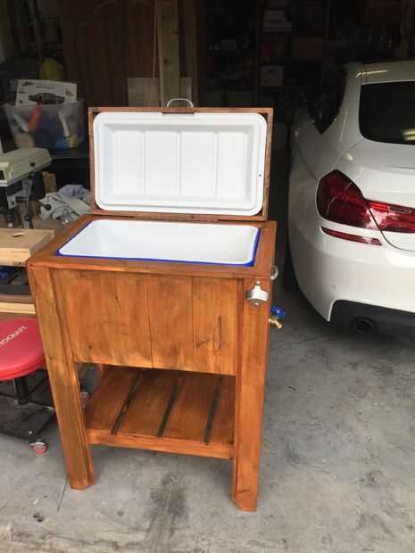 de vallado de pino tratada a presión, pegamento para madera y algunos artículos de plomería simple. Tomó un día para construir y un día a la arena y la mancha. El refrigerador es 48 cuartos de galón. Hace un gran regalo.