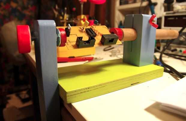 El titular de la tarjeta de circuitos se une a la mesa de trabajo con la pinza incorporada en la parte inferior, con el botón naranja hacia usted. De esa manera usted tiene fácil acceso a ambos lados de la Junta. El titular de la tarjeta de circuitos por supuesto se puede construir para acomodar cualquier tamaño de placa de circuito. Me decidí por un máximo de 12 cm entre las mordazas, ya que sólo funcionan con placas relativamente pequeñas.