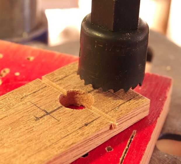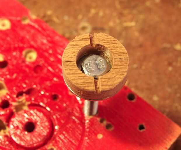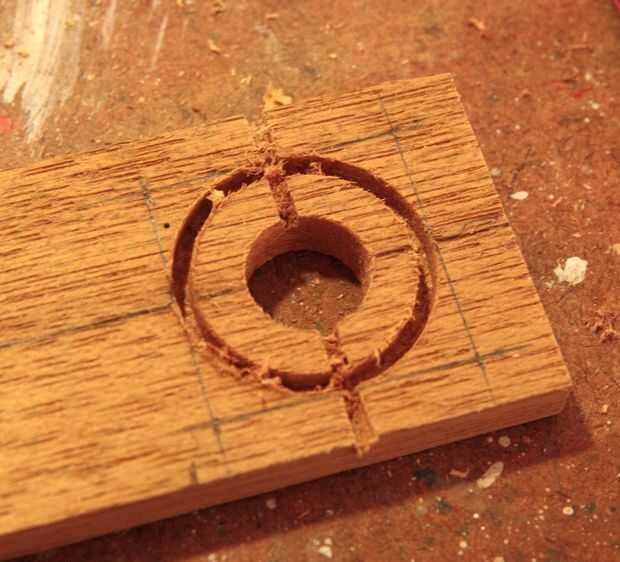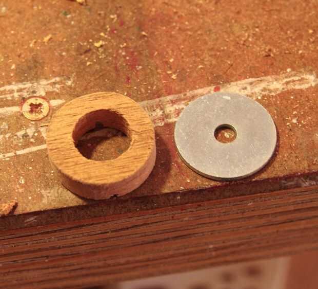 Primero tomó un pedazo de madera grueso de 8 mm y hace una ranura en toda su cara con una banda Sierra (primera foto). Luego perforé un agujero de 12 mm a través del centro de la ranura (segunda foto). Después cuidadosamente colocado mi Serrucho sobre el agujero y cortar el anillo. Mi objetivo era no son perfectos, pero bueno bastante (cuarta foto). En la siguiente foto el anillo está listo para ser pegado a la lavadora y en la segunda foto de la derecha se coloca en su lugar en la lavadora.