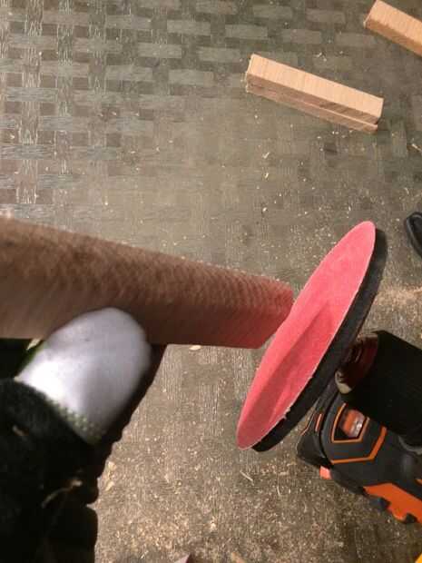 Para el lijado inicial utilicé un inserto circular que pones en el taladro que usted coloque las almohadillas para que para lijadoras circulares. Consegui esto en Home Depot para cerca de $7 y vino con unos granos diferentes de papel. El labio que corte en un ángulo de 45 grados se lija para casi se asemejan a una curva que puede obtener desde un router para que se vea un poco más pulido. Luego utilicé un papel más fino sobre la broca circular, luego pasé a papel arena acabado muy fino que a mano solía conseguir todo muy suave.