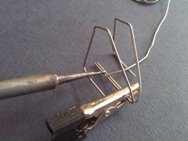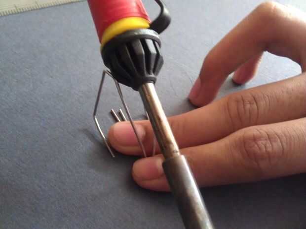 Tomar 2 pernos de U. Y luego con la ayuda alicates doblar la parte superior de la upin como se muestra en la imagen de arriba. Luego tirar y doblar el upin con alicates. Tire el uno con el más corto hacia el exterior final. Hacer lo mismo u otro, pines también. Ahora usted tendrá dos pasadores y pernos de usted deben estar parado al igual que la imagen de arriba. Mida el ancho de su soldador de la posición de explotación y ahora con la ayuda el dedo Únete tanto los pasadores u y colocar el cautín en él y comprobar si el soldador no está cayendo. Ajuste el ancho de los pernos de u según su anchura soldadura. Una vez su medida perfecta el ancho de los pernos. Ahora con la ayuda del pin de cocodrilo unen ambos pernos de u según la medida al soldarlos juntos. Ahora soldar las partes junto con alambre de soldadura. Y colocar el soldador y asegúrese de que la punta no debe tocar la superficie de la mesa. Y si toca doblan sus piernas y ajústelo. El frente y la parte principal está completa.