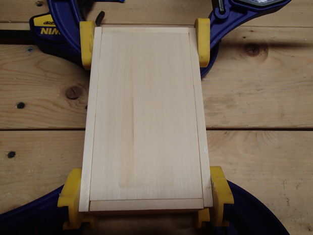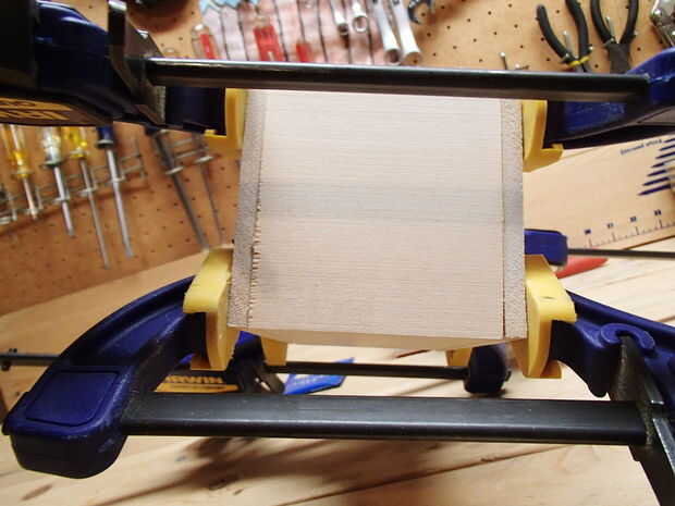Antes de pegar, lijar las aristas de corte. Asegúrese de que todas las piezas alinean derecho. Si una pieza es demasiado grande, me encontré con que papel de lija de grano 60 uniformar rápidamente las piezas hacia fuera. Cuando todas las piezas se alinean, untar una capa delgada de pegamento en todas las superficies a encolar y sujetar juntos.
