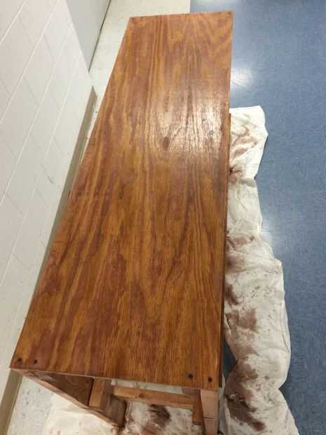 4. ahora es el momento de aplicar el poliuretano. Esto le dará a su producto terminado ese acabado brillante. Primero pulir la tabla usando el papel de grano 220 arena. Limpie el polvo. Ahora abrir la lata y revolver nuevamente en un movimiento de ocho para evitar burbujas de aire. Utilizar un tercer pincel diferente para la aplicación. Para el paso al aplicar el acabado Asegúrese de cepillar en el grano de la madera para la mejor apariencia. Deje que se seque durante la noche. El siguiente es opcional cuántas veces se aplica el poliuretano. Cuantas más veces Repita el proceso el más brillante parecerá. Cada vez que simplemente Repita el procedimiento en este paso.