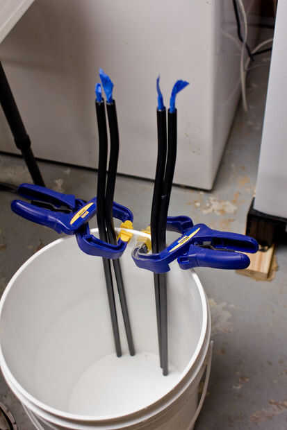 Mezclar más JB weld o cualquier epoxi en este punto. Cualquier cosa que no recomiendo solidificación rápida. He puesto todos mis soportes en un cubo para hacerlo easer para trabajar en ellos. El perno debe ser un montón lo suficientemente fuerte como para soportar estos altavoces pequeños. Sin embargo, queremos llenar el espacio muerto en los soportes de altavoz entre las roscas del perno y el interior de la tubería metálica para que el cerrojo permanece en su lugar.