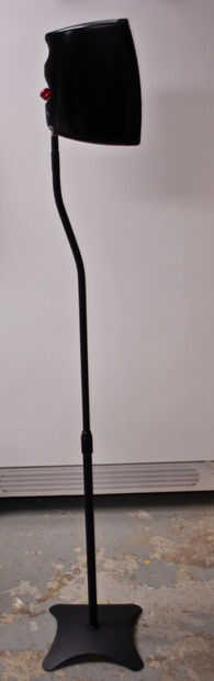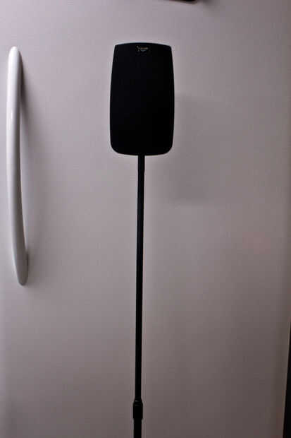 Primero Deslice uno de los refuerzos de triángulo que sacó de los oradores anteriores en la parte inferior del tubo de soporte del altavoz hasta que alcance la articulación esférica. No conecte todavía el altavoz.