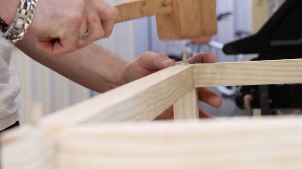 Perforaciones adecuadas al tamaño de los tacos y luego insertarlos utilizando pegamento de madera. Asegúrese de que Aplique pegamento en el agujero y la espiga. Esto asegura mejor adherencia. Los tacos se pueden conducir en el uso de un mazo. Si usas un martillo ten cuidado porque puede dividir la espiga.