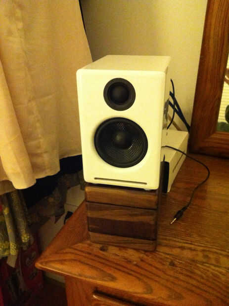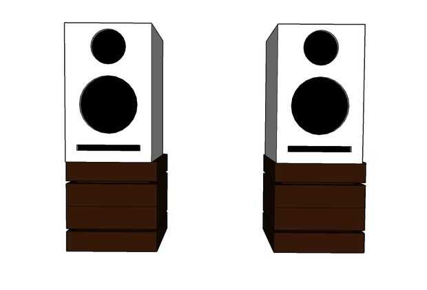 La primera foto es los soportes de altavoz acabado en mi mesa de computadora en casa, la segunda foto es un modelo de los stands con los altavoces en Sketchup.