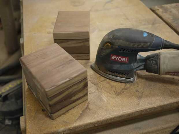 Empecé lijando los lados con papel de lija de grano 80 en la lijadora orbital para nivelar pequeñas crestas en los empalmes del pegamento. Ten cuidado cuando cerca de las esquinas, no quiere acabar con la lijadora. Cuando los bordes están todas al ras y las caras son planas, tomar un descanso de lijar y pasar el router. Terminaremos de lijado más fino más adelante.