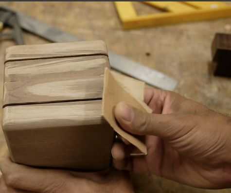 I mano lijar con papel de grano 80, luego grano 120 y grano 220. Lijar toda la pieza uniformemente - no centrarse demasiado en un área o una cara de arena demasiado agresiva, que puede dañar las esquinas bien redondeadas. Fui por delante y lijar ambas piezas a mano en lugar de usar una lijadora eléctrica.