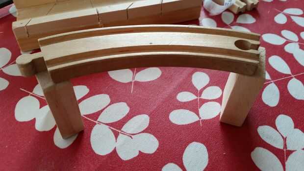 Nuestro sistema de pista de tren de madera (una mezcla de Brio y Lillebo de un chop de caridad) carecía de ensambladuras y acaba de tener un puente jorobado, por lo que hemos añadido un conjunto barato de Morrisons a nuestra colección.