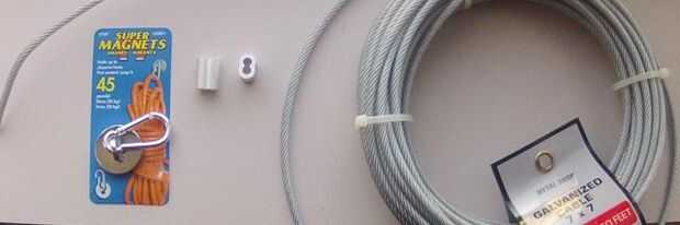 Materiales y costo aproximado 1 «super imanes» alta potencia revestido de carabeiner imán (menards) $5 1 paquete de acopladores de Cable (menards) $2 cable de acero (menards) 1 de 4-5 pies cubiertos $5/carrete (no foto) Código postal lazos 20ct (menards) $2
