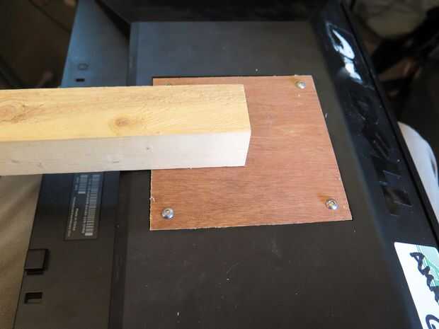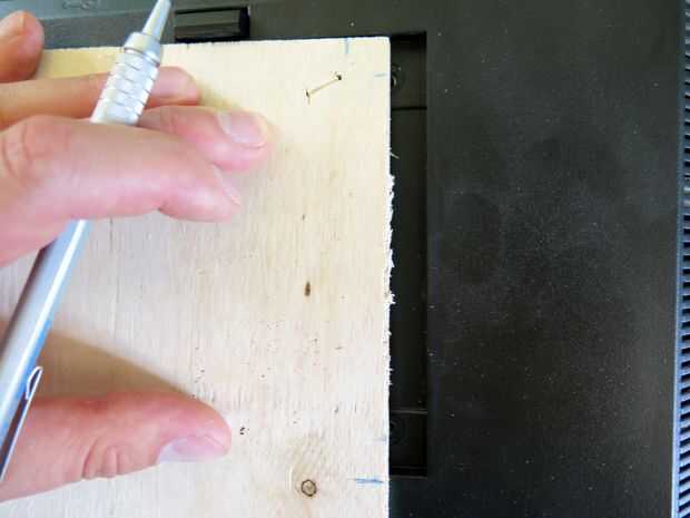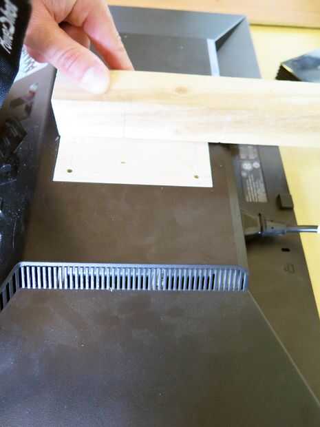 El monitor tenía un bonito patrón de montaje VESA en la espalda, que hizo esta parte bastante simple. Primero medí de los cuatro lados de la plaza que tendría que cortar el panel de montaje. Luego medido en los centros de los agujeros de montaje y marcado por la Plaza resultante con la speedsquare. Corta el cuadrado en la sierra, utilizando la guía como guía. Resultó que la guía no era totalmente cuadrada, así que tuve que volver y hacer unos pocos ajustes, corte otra vez y asegúrese de caería en el área de la placa de montaje en la parte posterior del monitor.