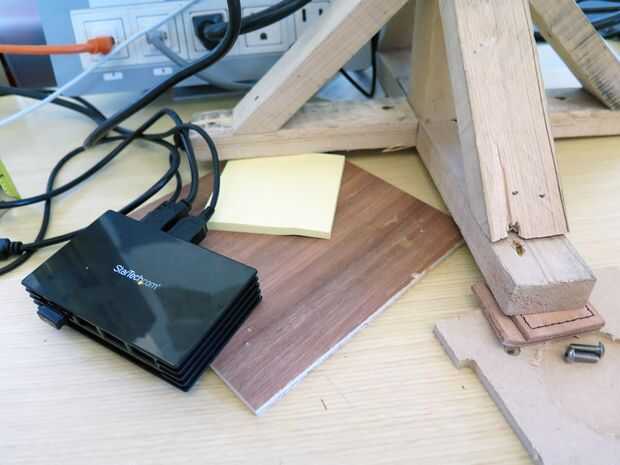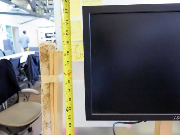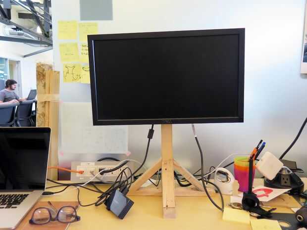 Después de correr de nuevo arriba a mi escritorio y comprobar todo para ajuste, montara al monitor al soporte. Tiene bastante cerca de mi altura de objetivo de 16" la línea central, aunque es algo fuera de nivel. Tuve que suplementar utilizando algunos (ejem) local materiales.