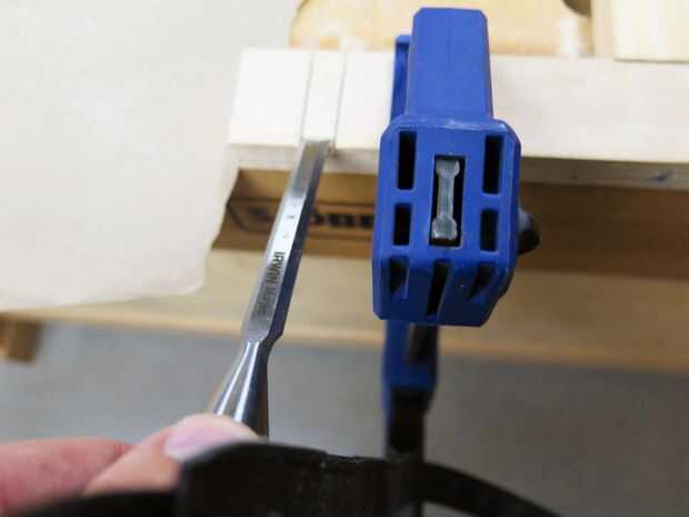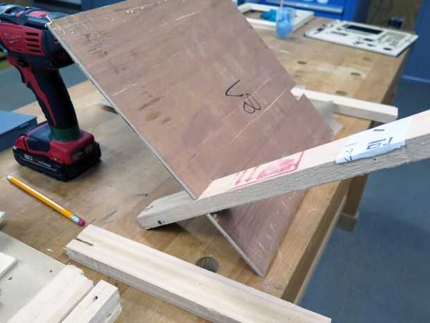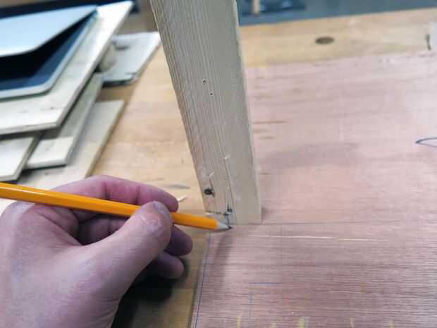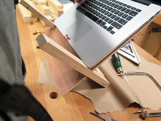 Poner el portátil en el soporte y Mira cuánto tiempo desea que los talones para empujar hacia fuera en la parte superior. Una vez que esté bastante seguro de que tiene la longitud que desee para la riostra, recortar los talones. Muesca con una sierra de mano, luego pedazo hacia fuera con un cincel para hacer las muescas que mantendrán tu ordenador portátil vertical.