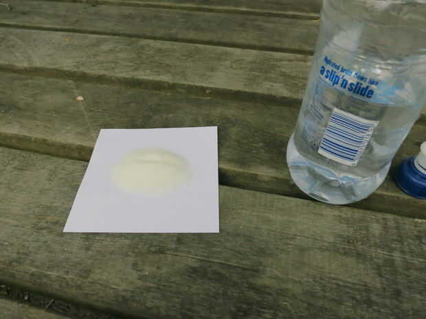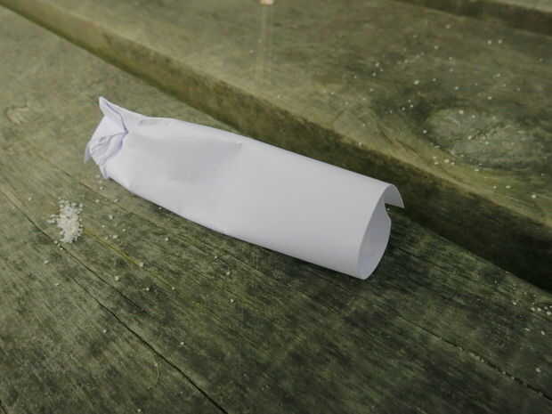 Ponga alguÌ n polvo en el centro de la pieza de papel. Desea tanto como puede pero aún ser capaz doblar para arriba muy bien. 1 1/2 T funciona bien para una botella de 400 ml.