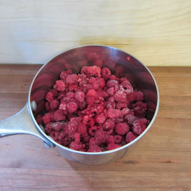 1. en una olla mediana cocinar 12 onzas de fresas congeladas y 1/4 taza de agua a fuego medio hasta que las bayas comienzan a soltar sus jugos.