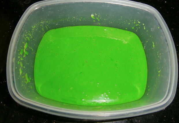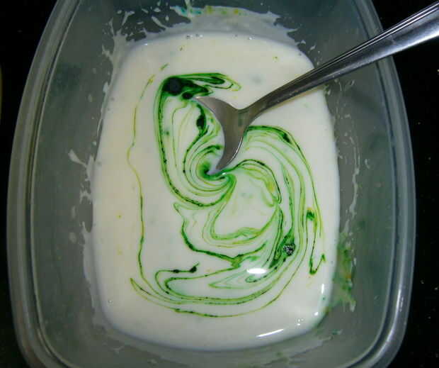 Se crea la capa exterior verde con helado de vainilla con una pizca de color de alimento comestible de manzana verde.