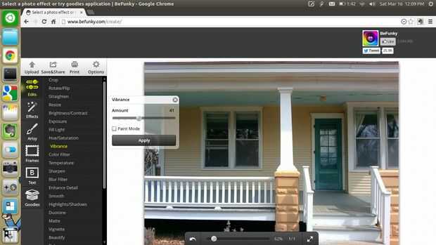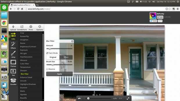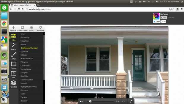 En primer lugar, visite el sitio web de BeFunky, o conseguir la aplicación de cromo Si utilizas Google Chrome. Haz clic en 'Subir' y luego seleccione la imagen que desea editar, imagen 3. En primer lugar, me enderezó mi cuadro, cuadro 4, luego ajustar el brillo y contraste, imagen 5. Luego utilicé la herramienta intensidad para hacer los colores muy pop, cuadro 6. Después de eso, usé el filtro Desenfoque en el modo de la pintura, que hizo toda la imagen un poco borrosa, a continuación, utiliza el pincel para hacer la puerta verde sostenido por lo que realmente estaba parado hacia fuera, cuadro 7. Última, haga clic en guardar & Share para descargar tu foto, cuadro 8.