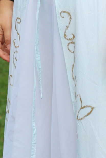 Querido mío para ser de oro y estaba dispuesto a intentar cualquier cosa de acrílico pinturas rotulador oro (bordado iba a tomar demasiado largos sin una máquina CNC). Lo que encontré fue alguna pintura en aerosol oro. Había rociado algunas en un plato de papel. (No uses un SOLO cup. Resulta que la pintura de aerosol funda la parte inferior hacia fuera.) Luego usé un cepillo a mano alzada los diseños en la tela. Secado muy rápido!