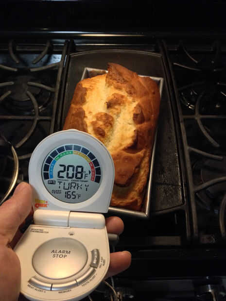 El pan está listo cuando alcanza una temperatura interna de 208 grados F (99 C) justo por debajo del punto de ebullición. Personalmente no detendría a 205 grados. Esta podría ser la parte más delicada de todo el asunto. Queremos suficiente agua han sido absorbidos como sea posible sin que se sequen por evaporación. Demasiado húmedo y la parte inferior de tu pan se convierte en crema. Demasiado seco y bien... todavía hace buen pan.