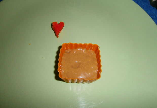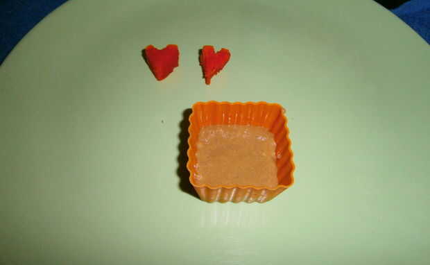Coloque el corazón en el centro del molde de Cupcake. Observe la posición de modo que cuando corte el corazón será visible.