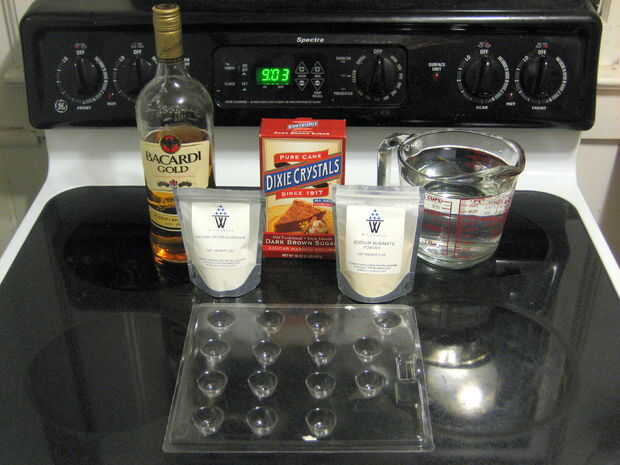 Preparar la solución de bola Ron mediante la mezcla de Ron, azúcar moreno, sal de calcio, melaza y especias en el agua. Calentar en el microondas hasta que todo se haya derretido y filtro para eliminar el exceso especias.