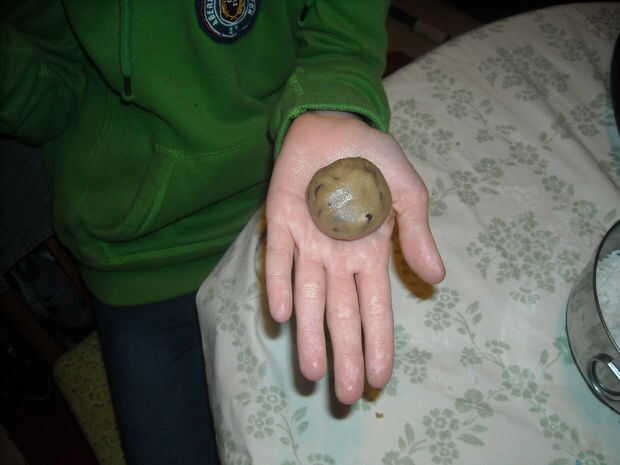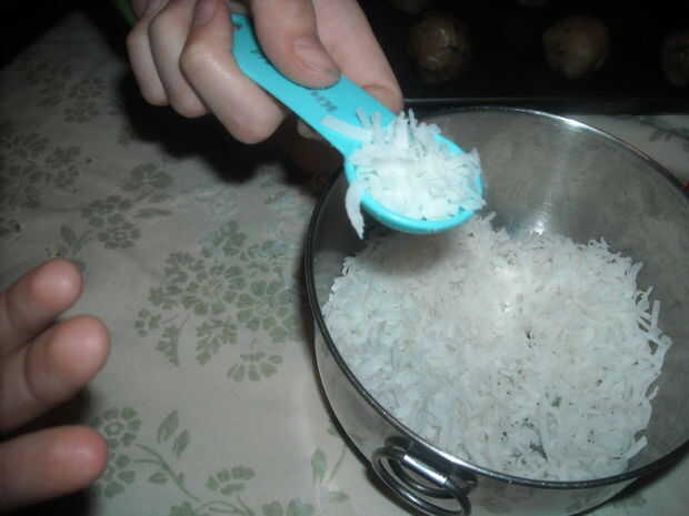 Cucharada de 1TSP de coco (no PACK) y escoger 3 virutas de Chocolate. Mezclar en una bola de masa.