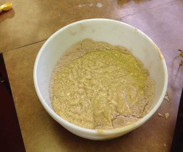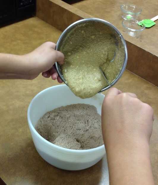 Vierta el azúcar, la mantequilla, mezcla de huevo en el recipiente con harina, cacao, sal y bicarbonato de sodio