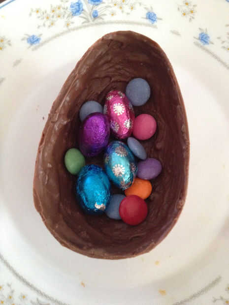 Una vez que endurezca el chocolate, lo desmoldar y rellenar con chocolates mini (u otros que mencionado). Sujete ambos lados del huevo con chocolate derretido y empieza a decorar!