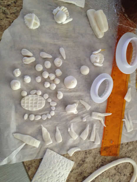 Mientras tanto, hacer decoraciones con fondant (u otros mencioné). Color, forma, cortar lo que quieras.