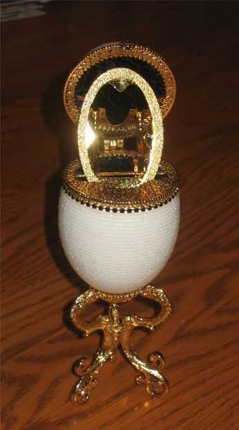 esto es un huevo de oca con cuentas. Está articulada con un anillo de bisagra marco de cuadro emergente. Este huevo entró en el programa de maestría del gremio de arte del huevo de internacional en la categoría de cuentas/Jeweled. Ganaba a mi novata en moldeado/Jeweled con este huevo. El marco interior es ahora sostiene una foto de un Caniche Toy que tenía 15 años, Tiffy.