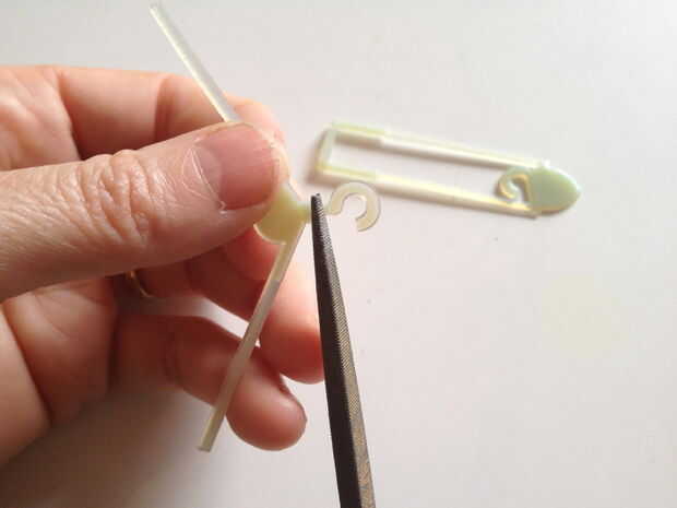 Poner la pieza que parece un gancho a través de la ranura en la otra pieza y ver si gira fácilmente. Puede que necesite utilizar un pequeño archivo para alisar hacia fuera.
