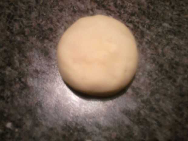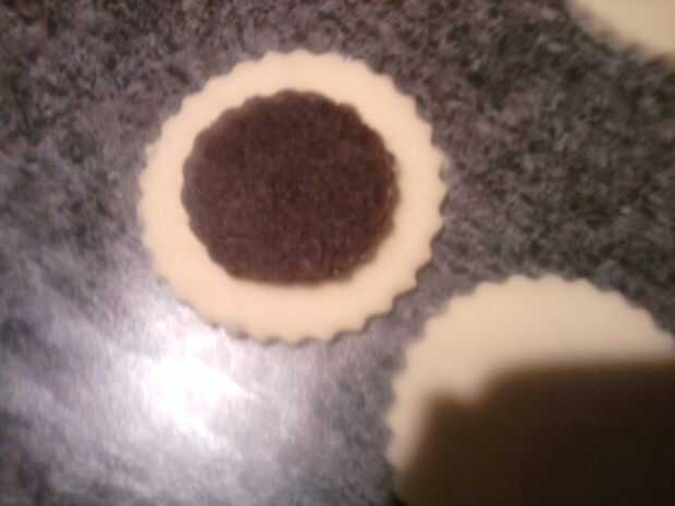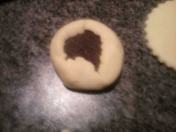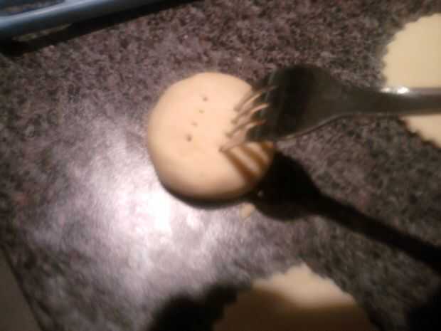 poner la mitad cocidas cookies y galletas crema en medio corto crudo más grande discos de cáscara de pan y doblar los bordes sobre y añadir un poco de masa de pan extra corto si es necesario cubrir las galletas y poner crema galleta, pinchar la cáscara y cocinar durante 20-30 minutos a 150 * c, poner sobre rejilla para enfriar y disfrutar de