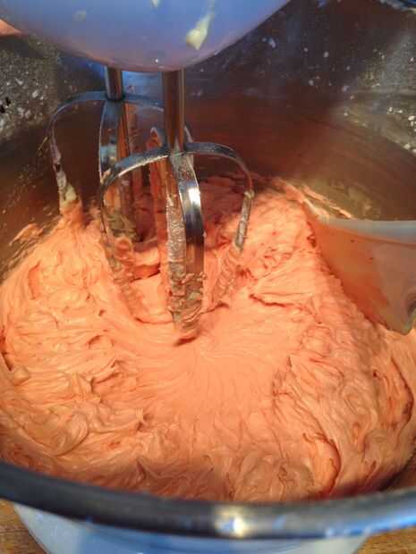 • Una vez que el glaseado de mantequilla parece un poco más como guinda añadir el colorante alimentario rojo hasta que convierte en un rosa pálido.