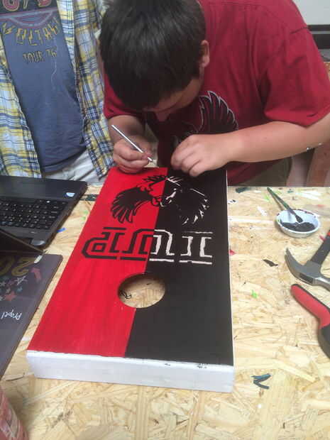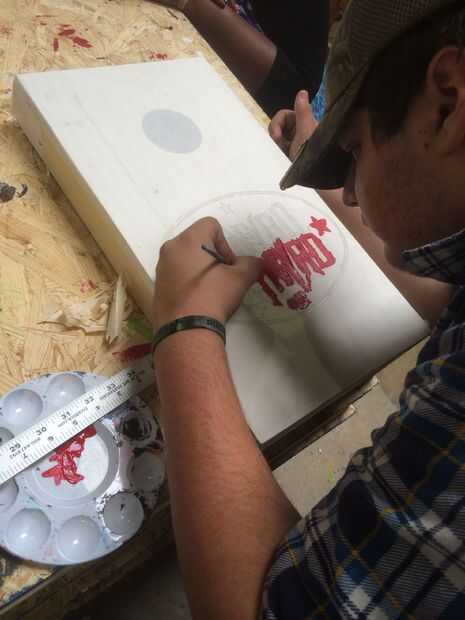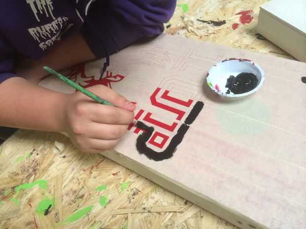 Con una plantilla preparada y en lugar de la Junta, hemos pelado las áreas pintadas de otro color luego pintado cuidadosamente las áreas expuestas. Aprendimos que es mejor pintar en la dirección de los bordes de la cinta siempre que sea posible para evitar forzar la pintura debajo de la plantilla.