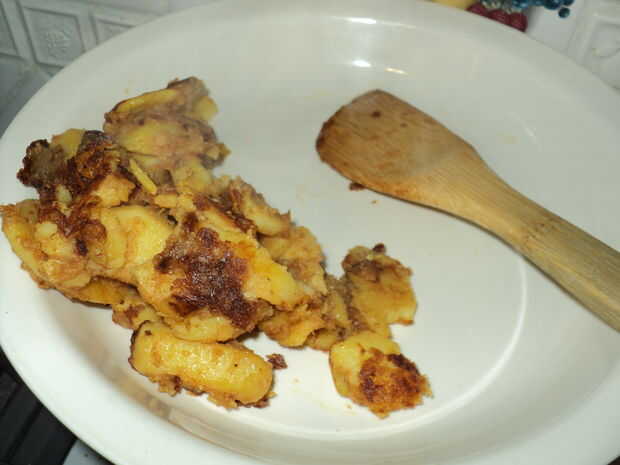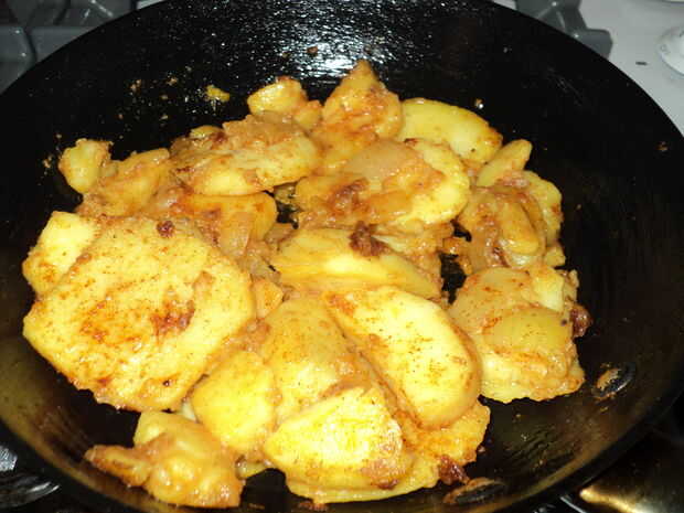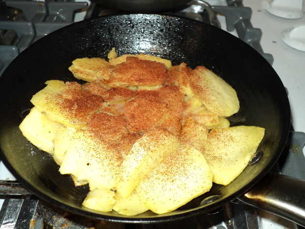 Deslice en un lote de patatas precocidas y espolvorear con pimentón para darle color. También puede Agregar en algunos pimientos en cuadritos que he tenido ninguno.