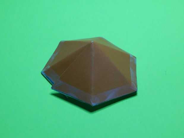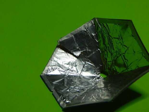 En este paso que será cortar dos aberturas en los lados interiores del triángulo cortado en el paso anterior, estos permiten los lados bloquear y crear lo que se ve arriba. Usted puede tener a arrugarse un poco los bordes para que sea la forma. No use cinta para unir los dos bordes porque tienes que deshacer el plato por lo que puede ser doblado para arriba. También será necesario un orificio a cortar en el agujero para que el LED puede colocarse en el centro.