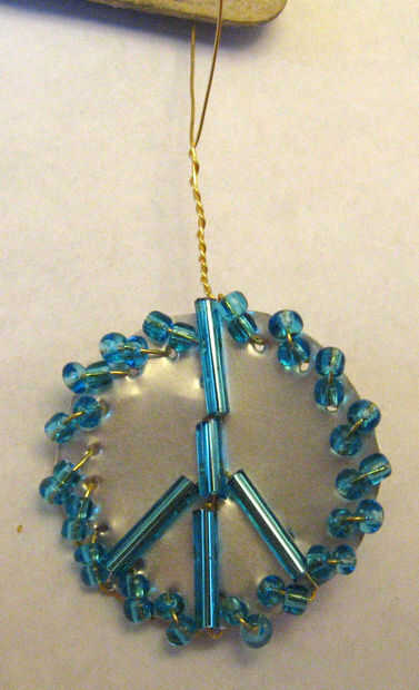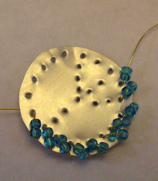 4. Si usted quiere una línea sólida de granos, usar una puntada atrás e ir a través del mismo agujero dos veces. De la parte inferior, pase al segundo subproceso de agujero y tire de la parte superior, añadir grano y bajar por el agujero anterior se omitió. Saltar al siguiente segundo agujero, repito. Esto es como lo hice el centro del colgante de símbolo de paz.