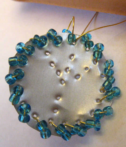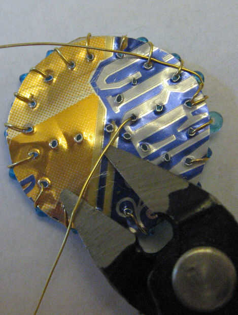 3. el más simple método es cubierto el borde. Alambre a través de un orificio de encaje y doble para asegurar (1-1/2 pulgadas de alambre para asegurar el extremo opuesto, cuando termines de dejar cordones). Cualquier opcionales bolas en el hilo del hilo de rosca. Encaje el alambre sobre el borde externo y a través del siguiente agujero (de la parte inferior). Tirar cables ajustados - tenga cuidado de no doblar el cable. Utilizar los dedos o pinzas para mantener el alambre en un lazo bonito como usted Tire firmemente. Repita según sea necesario.