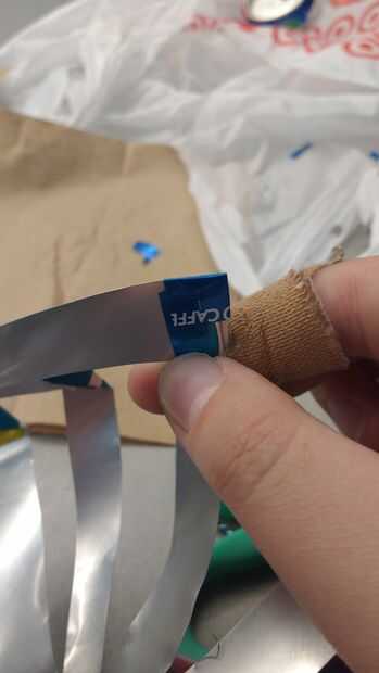 Tomar dos tiras justo al lado de la otra superposición uno en el otro por debajo de la aleta y crea un ángulo recto.