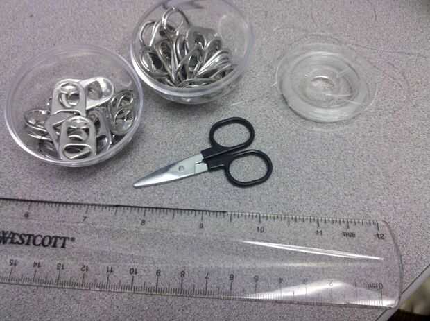 empezar a los contenedores de reciclaje asaltar a!Aluminio de vuelta puede pestañas en joyería cool!Paso 1: Reúna los suministros Para empezar, necesita una pila de fichas pop. Entre 20-26, dependiendo de tamaño de la muñeca.También necesitas tijeras