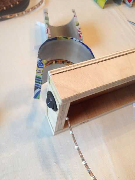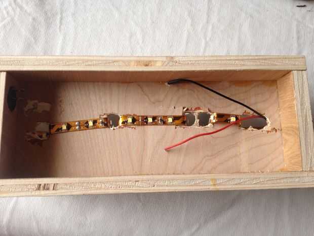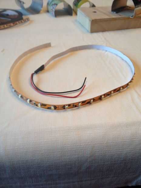 Cortar alrededor de 30 pulgadas de la tira de luz LED, asegurándose de que uno de los extremos tiene los cables conectados a él. Luego, retire el adhesivo y pegar los LEDs en el interior de la can. El LED por el agujero que perforó y repita para el resto de las latas de la armadura. Derecha ahora es un buen momento para poner el interruptor de eje de balancín en también. Pegamento caliente las lengüetas de las latas a la base.