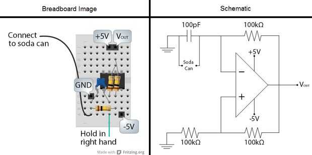 - Manteniendo el cable verde en la mano derecha, su cuerpo es ahora parte del circuito. Esto le permite usar su mano izquierda para actuar como una placa de un condensador con la lata de soda.