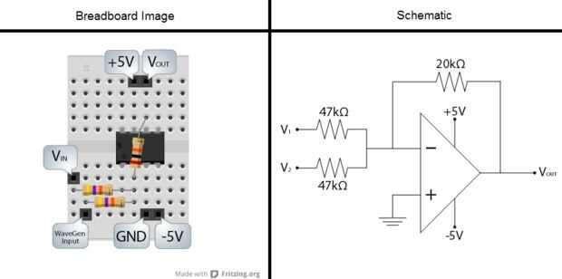 Para ahorrar espacio en nuestra protoboard, utilizamos generador el Analog Discovery arbitrario (en el Software de formas de onda) para actuar como el oscilador fijo. En el dispositivo analógico descubrimiento, este es el cable amarillo con la etiqueta "W1".