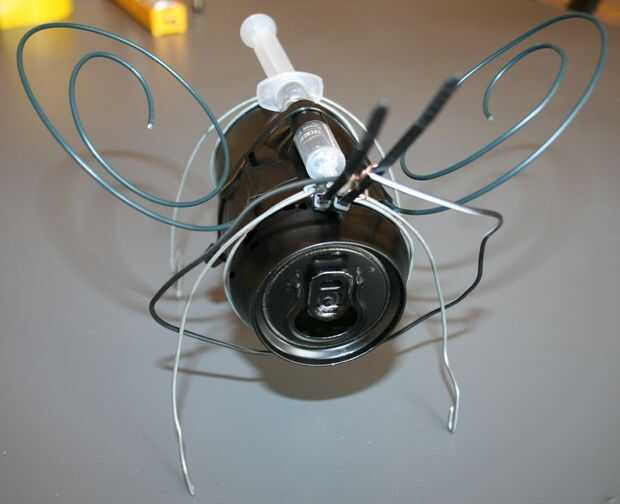 Fije las patas y las alas usando cinta para garantizar a la lata. Cinta el montaje del motor al vientre del bug y el portapilas a la parte superior con cinta para asegurarlos en su lugar y amarre con el lazo de cable más largo. Introduzca la tapa de soda entre la can (órgano) y montaje del motor para permitir el libre movimiento del motor y su carga (ver imágenes anteriores de paso). Utilizar los dos lazos de cable corto como antenas para el error. Esto es sólo una función estética, como es la pintura la lata antes de ensamblar el error. Tomé algunas fotos de uno que pintados de negro, a la que quería añadir franjas amarillas para que se vea como una abeja. Lamentablemente, mi viejo estudiante 8y no decidió que el fallo como una abeja (informó que no puede ser una abeja porque sólo tiene 4 patas).