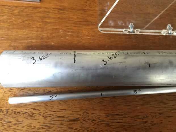 A continuación cortar 1 pieza de la 2" de diámetro barra de aluminio que es 3 y 5/8" (3,625") largo. No te preocupes de ser exacto. Puedes cortarlo 5,75" de largo. Algunos de los extremos se desprenderá durante la orientación.