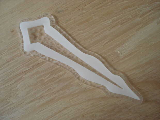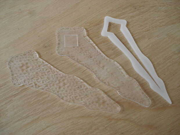 -Si quieres un patrón en la pieza, para ello como el último paso (van a ver por qué en sólo un minuto). Si está usando un color de acrílico sólido, colocar la pieza en el agujero del recorte, hacia arriba. Si usas acrílico claro, como yo, te recomiendo hacer el patrón en la parte posterior, como el patrón parece "pop" a la mejor vanguardia de esa manera.