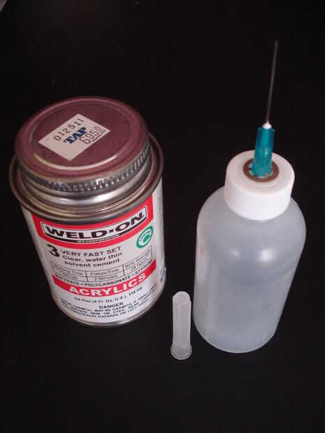 -pegamento de acrílico (utilizado soldar 3 cemento, fraguado muy rápido, con una botella de Romo aplicador hipodérmica – disponible de los plásticos de grifo)